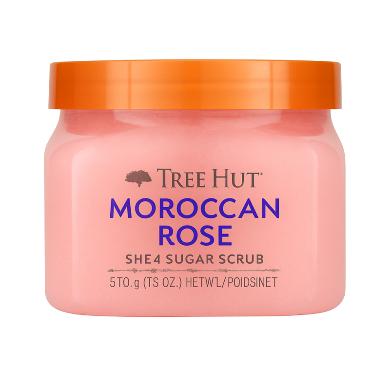 Tree Hut Moroccan Rose Shea Sugar Scrub gently exfoliates with natural sugar. Enriched with shea butter, rose extract, and argan oil, this luxurious scrub nourishes and smooths skin while providing a romantic floral scent.